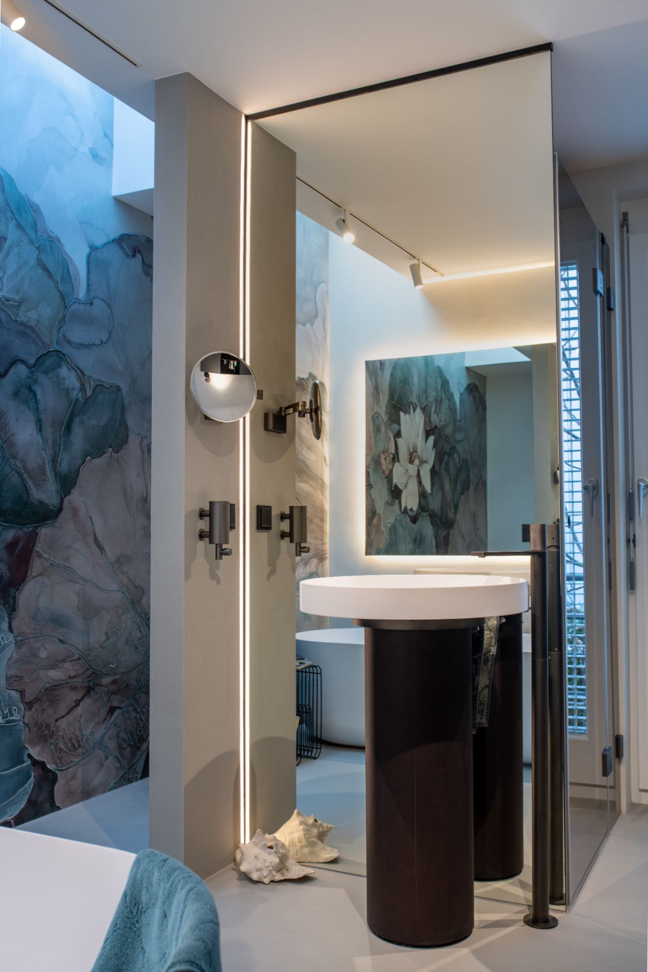 Dieses Badkonzept vereint moderne Klarheit, künstlerische Ausdruckskraft und funktionale Raffinesse. Im Zuge einer ganzheitlichen Sanierung entstand ein Raum, der gestalterischen Anspruch und handwerkliche Präzision verbindet. Sorgfältig ausgewählte Materialien, durchdachte Lichtführung und fugenlose Flächen schaffen ein ruhiges, elegantes Gesamtbild – ästhetisch, zeitlos und pflegeleicht.